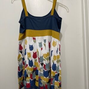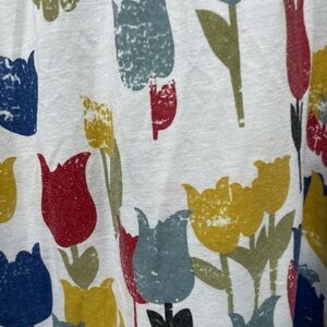 Max Rave size medium color block shirt. 60% polyester, 40% rayon. Shirt is blue brown and white with a tulip print on the white. Shirt flares out some. Shirt has normal wear and a small amount of pilling, but still in good shape. This shirt is probably from somewhere in the 2005 to 2010 era.