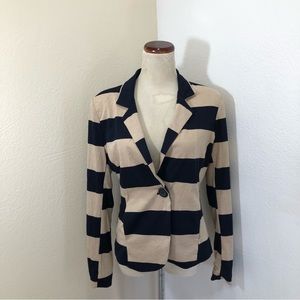 Polyester/rayon/spandex blend fitted jacket in a navy and beige stripe with gray and white stripe lining. Collared with a single button close, hand pockets and slight shoulder pads.