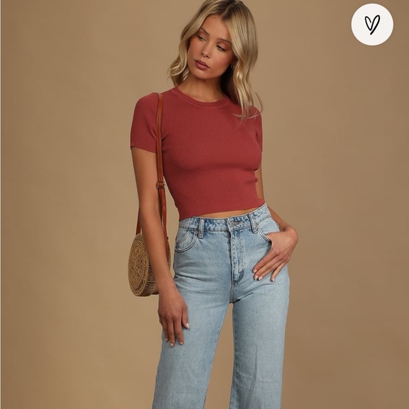 Ribbed stretch knit shapes this sweater tee that has a rounded neckline, short sleeves, and a fitted bodice. Pair this top with all your high-waisted bottoms for a retro-inspired 'fit!