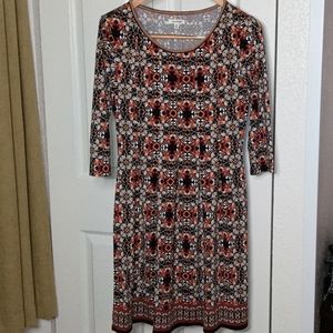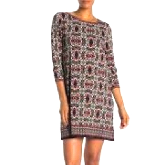Max Studio 3/4 sleeve shift dress in earth tones.