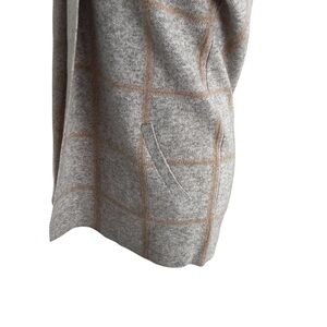This thick luxurious cashmere sweater cardigan jacket is in excellent condition. It has side pockets. Long sleeves that are cuffed. Shawl collar. Can be worn in place of a blazer. Super luxurious high-quality cashmere. Measurements are provided in the photographs. It is 20 inches pit to pit. Spectacular heather gray and peach window pane Knit.