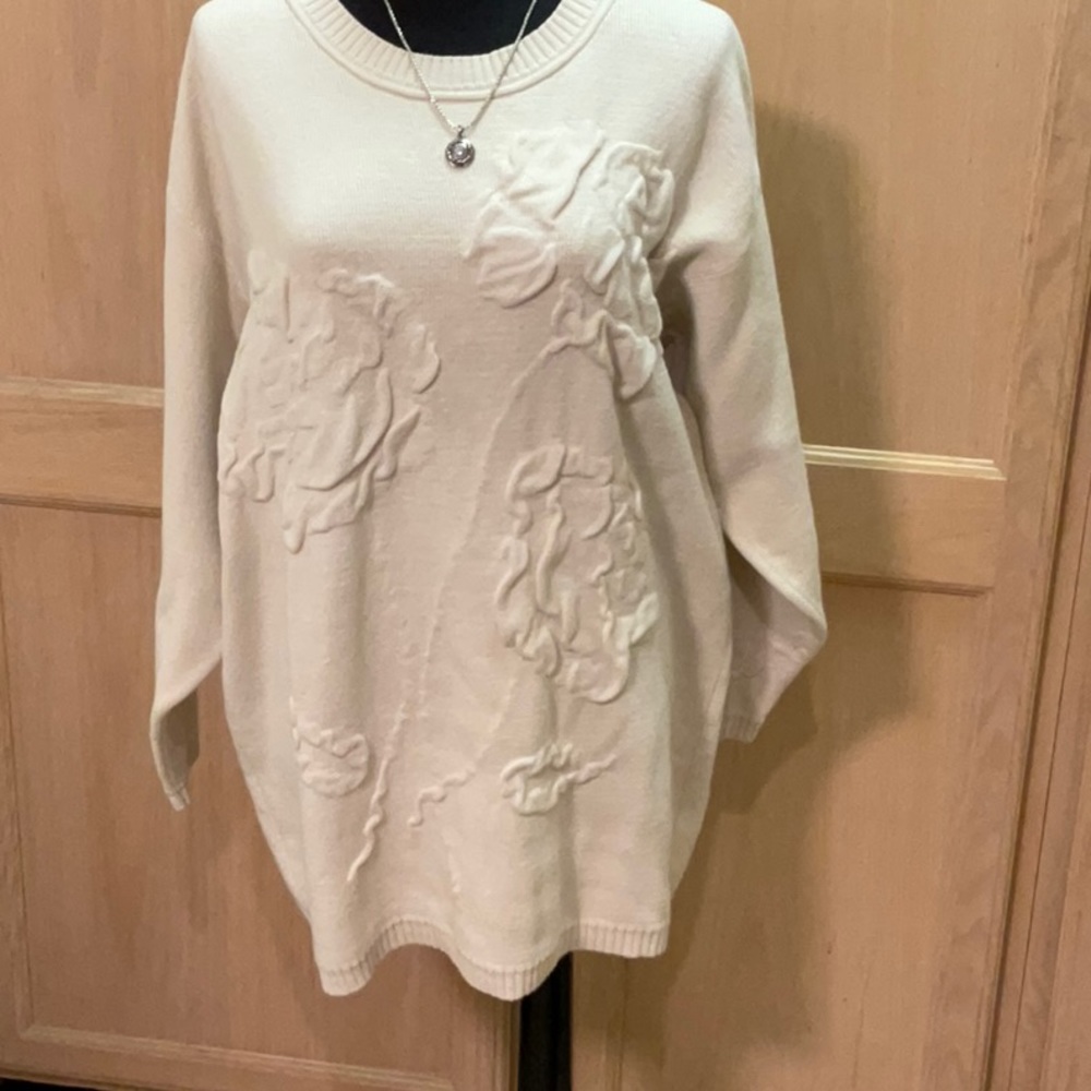 Vintage 90’s by Max Studio in LA, Ca with an unusual design feature. How the design was done I am not sure but it is on the front & sleeves of the sweater. It is 29 1/2”L X 22” Ap-Ap with 27” Sleeves