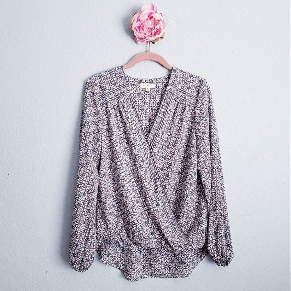max studio drape long sleeve blouse in denim fleur-de-lis