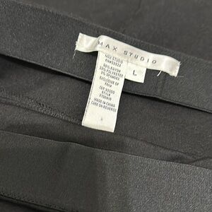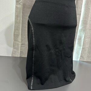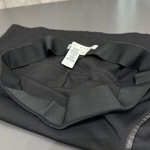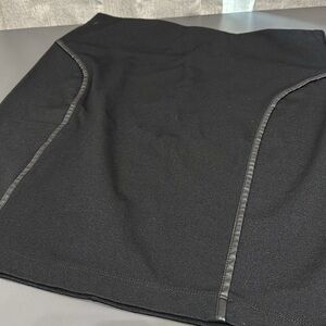 Max Studio. Skirt. Black with faux leather detailing. Women’s size large. Elastic waistband. Stretch fabric. Waist measures 16” across. Length measures 20”. Used. Good condition.