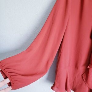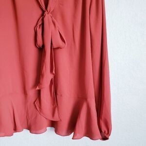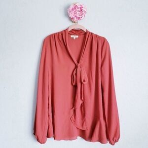 Max Studio offers fashionable, head-turning styles. This top features long sleeves, tie neck styling, trendy flounce hem, a V-neckline, and a solid color design