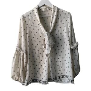 Max Studio Abstract Print Flowy Tie Neck Black & Beige Long Puff Sleeve Blouse