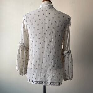 Max Studio Abstract Print Flowy Tie Neck Black & White/Beige Long Sleeve Blouse w Puff Sleeve Detailing