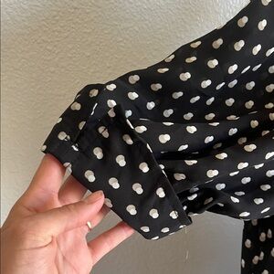Chic black blouse adorned with white dots. Features short sleeves and a classic collar. Perfect for any occasion.