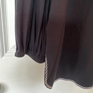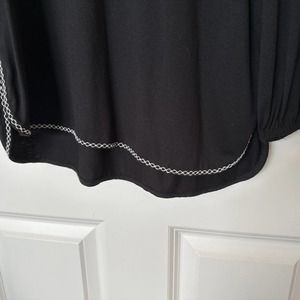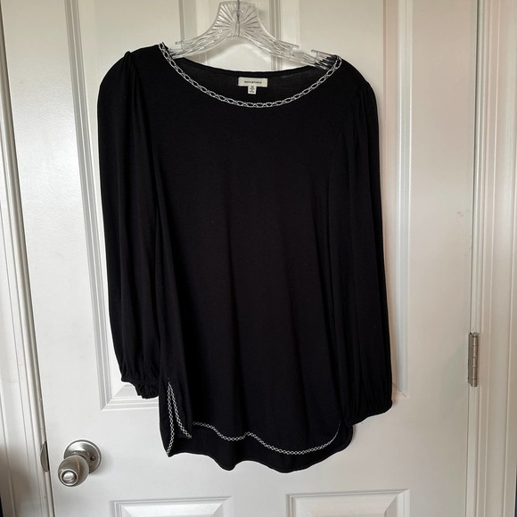 Max Studio Black Blouse with White Stitching- size XS with 3/4 sleeves. White stitching detail at neck and hem. Made of 92% Viscose, 8% Spandex Machine washable.