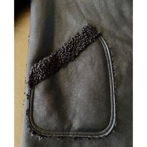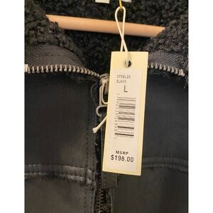 Max Studio Black Bomber Jacket Coat with zipper. Stylish faux leather black bomber with a cozy shearling collar with buckles that can lay flat or pull up to keep you warm from the cold. Front zip closure. Two front pockets. Perfect for a chic fall and winter look.