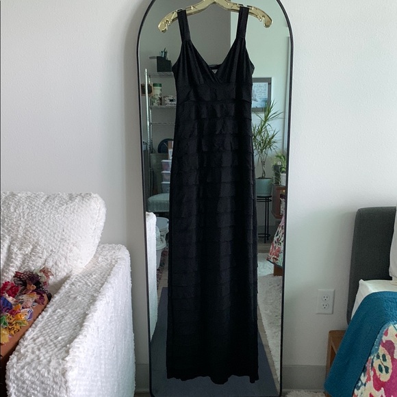 EUC Ruffles from top to bottom Dress goes to floor Flattering neckline Form fitting Comfortable No lining; I would consider lightweight