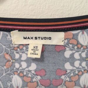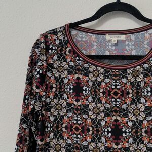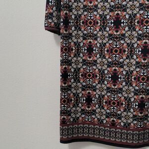 This preloved Max Studio Black & Rust Geometric Dress has 3/4 sleeves, knee length, with a mixed geometric pattern throughout in a spandex blend. A great dress for date night, travel, and business casual.