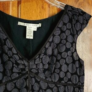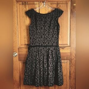 Elegant black Max Studio dress with textured polka dot pattern, form fitting with gathered full skirt, grosgrain ribbon tie at waist, cap sleeve, side zipper, fully lined.