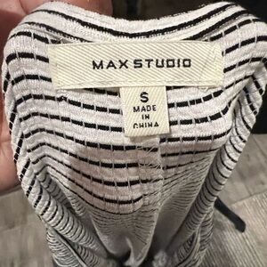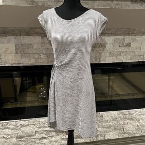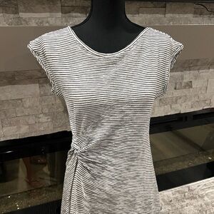 Great summer comfortable hi low dress with black and white stripes. Features a round neckline and short sleeves. Perfect for casual gatherings, running errands