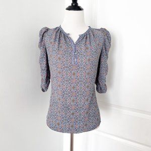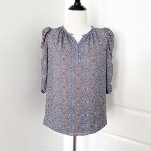 Max Studio Blue Floral Print Ruched Sleeve Blouse with a buttoned notch neckline