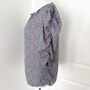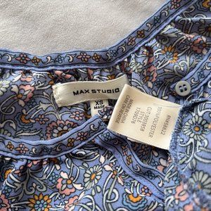 Max Studio Blue Floral Print Ruched Sleeve Blouse