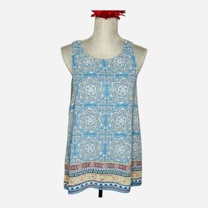 Max Studio, sleeveless top, boho, floral, tunic, blue print, summer top, festival, lightweight, casual, medium, flowy, beachwear, keyhole back