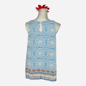 Chic and lightweight sleeveless tunic top by Max Studio, featuring a beautiful sky-blue floral tile print with intricate multicolor border accents. Flowy, relaxed fit with a scoop neck and keyhole button closure at the back.