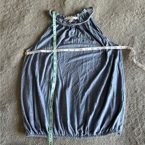 This Max Studio tank top features a ruched design with a relaxed fit, crafted in a soft blue hue. The sleeveless style and lightweight fabric make it perfect for warm weather, offering both comfort and elegance.