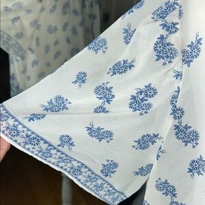 This Max Studio blouse features a relaxed, boxy fit with a soft blue floral pattern on a white background. The short sleeves and airy design make it a perfect choice for a casual, spring-inspired look.