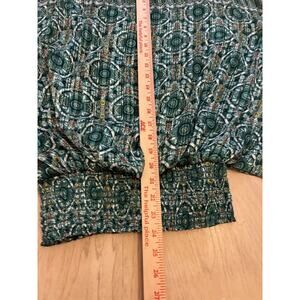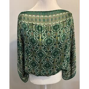 Max Studio Boho Handkerchief Blouse M Emerald Green Gold Smocked Hem Artsy Retro