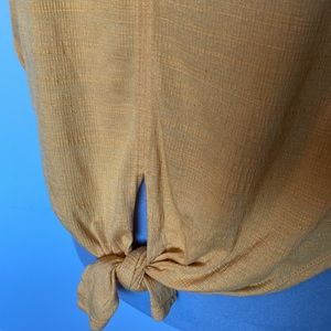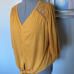 V-neck boho top with race detail at the shoulders and tie front at the hem.