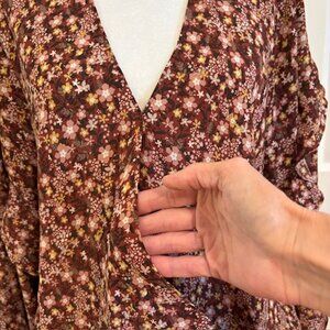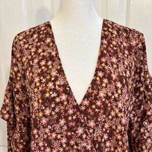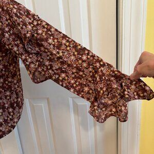 Max Studio Brown Floral Faux Wrap Top, Elastic Waist, Long Ruffled Sleeves Sz M