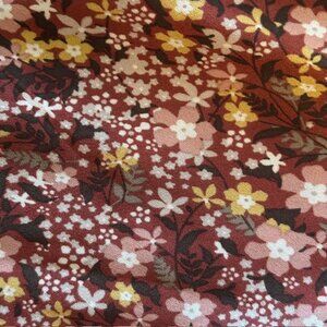 Pretty brown floral print. Faux wrap style sewn at the bustline. V-neckline. Elastic waist. Loose fitting. Beautiful, delicate ruffles everywhere! (as shown in the pictures) Made of 100% rayon. Machine washable.