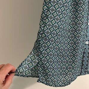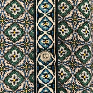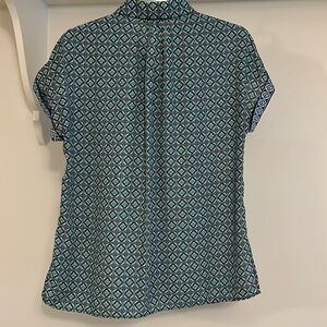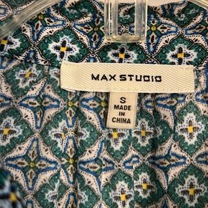 Button front blouse with cuffed, raglan sleeves by Max Studio in teal/navy/yellow print, machine washable polyester. Excellent condition. From a smoke free home. Offer is welcome. Bundle with another item for an additional discount!