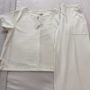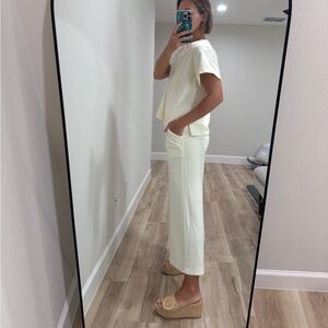 Chic cream set with wide leg design. Short sleeves and relaxed fit shirt. Ideal for versatile styling.