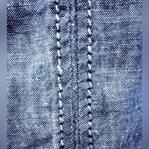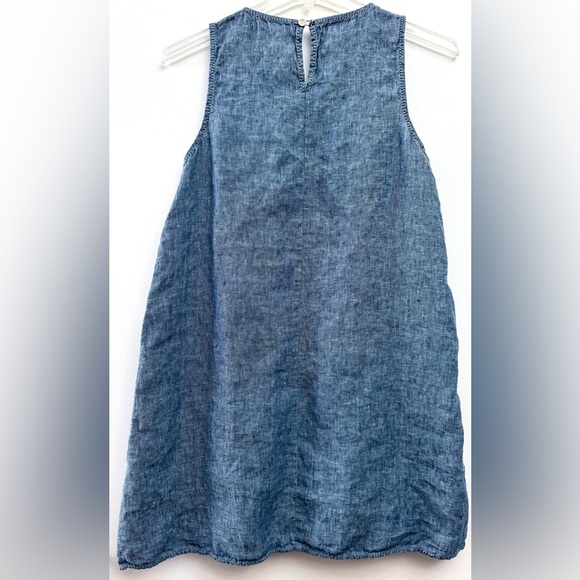 Chic denim look 100% linen mini dress. Sleeveless design and embroidered stitching on outside for design aesthetics. Nice large pockets for a sweet casual look. Perfect for casual outings or dress it up with a scarf and accessories.