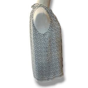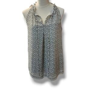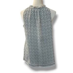 Sleeveless blouse from Max Studio. White with black polka dots. Open neckline with ties. Delicate ruffle at top of collar. Fully lined. Flowy. VGUC. Size small.