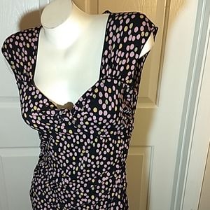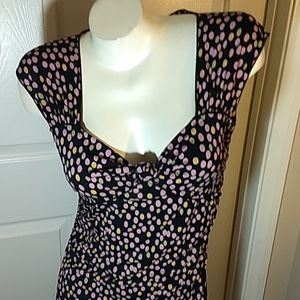 This slip on polka dot dress is flirty and dainty. Size Small with pink & yellow dots on black. Shark hem. (D41-309)
