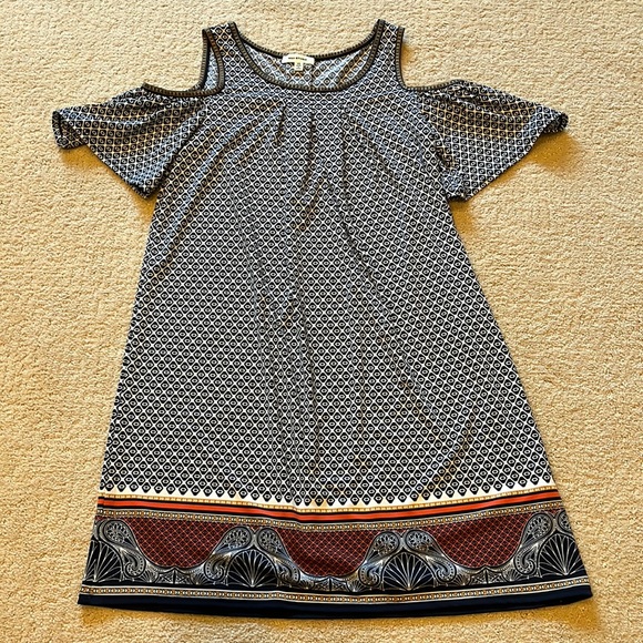 Beautiful shoulder cutout easy to wear dress. Can be casual with sandals or dresses up with heels and bold jewelry. In excellent condition.