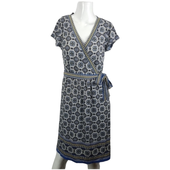 This is a new dress from Max Studio, with the original tags attached. The dress features a blue color with an allover geometric print, made from a jersey material that slips on over the head. The dress has a faux wrap style with a surplice neck and cap sleeves. It comes with an attached self-tie sash and has a partially elasticized waist. The dress is unlined and made from 95% polyester and 5% spandex. It is a size Small.