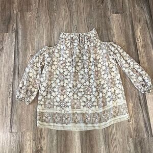 This top is made by Max Studio Edit. It’s a a printed cold shoulder with a tie at the back of the neck. Size medium and in very nice pre owned condition. Smoke and pet free home.