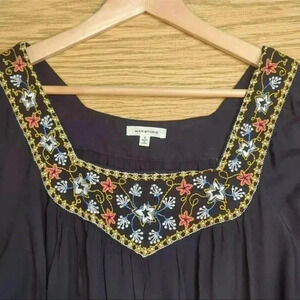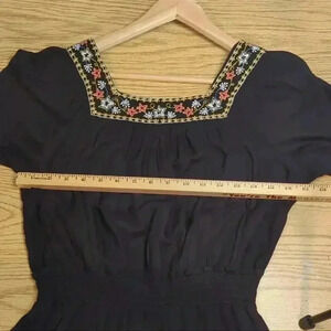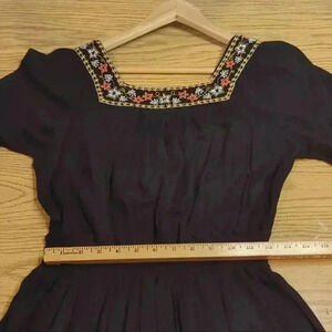 Bohemian style sz S NWT BLACK LONG SLEEVES TIRED SKIRT EMBROIDERED YOKE AROUND THE NECK OF FLOWERS COLORS OF WHITE RED BLUE GOLD MSRP 138.00