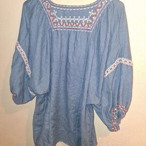 Max Studio Embroidered Boho Pesant Puff Sleeved Festival Blouse Cotton Blend S