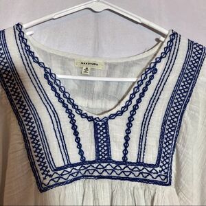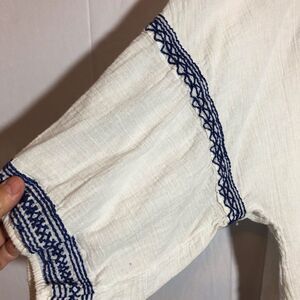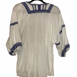 White gauzy blouse with blue embroidery in front, back and sleeves
