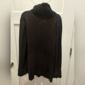 Stay cozy in this open-front black cardigan by Max Studio featuring plush faux fur trim at the collar and cuffs. Made from a cotton-acrylic blend for softness and warmth. Style A70602. Size Medium. Excellent condition—perfect for layering in cooler weather.
