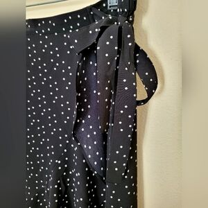 Max Studio side tie skirt with small polka dots and ruffled high-low hem. Size (US): Medium Length: 35.5 in. 96% polyester, 4% spandex
