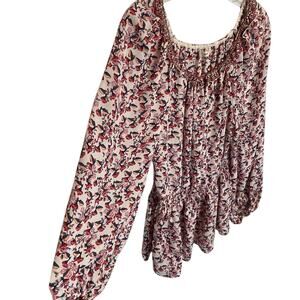 Max Studio Floral Blouse Womens Large Cream Red Smocked Waist Peplum Top