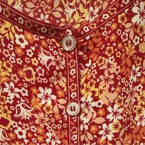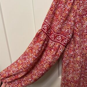 Chic floral blouse with vibrant red tones. Features a round neckline and long sleeves. Perfect for casual outings.