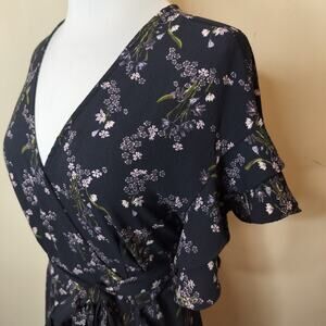 Max Studio navy / purple floral short sleeve wrap midi dress. Size L. Poly spandex. (23200)