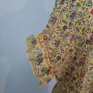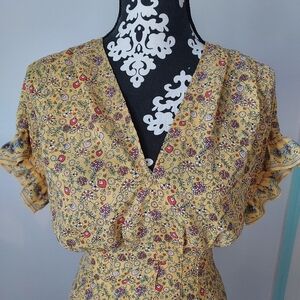 Max Studio floral dress in yellow, black, and white. Deep V-neck with ruffle trim, Stretchy shirred waist. Gently ruffled arm holes. Crepe fabric.