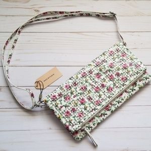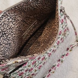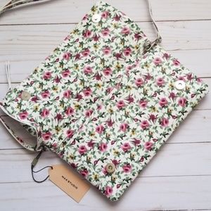 Beautiful Flower Print Fold Over Clutch | Silver Studded Detail in the Front | Pocket Under Fold | Unfold for Another Zippered Compartment with Zippered Pocket Inside and 2 Organizer Pockets | Strap is Adjustable and Removable
