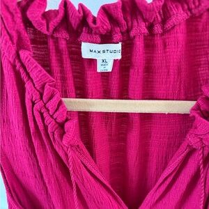 Vibrant fuchsia sleeveless dress with elegant ruffles. Ideal for stylish outings.Fabric is 70% Polyester,29% Rayon and 1% Spandex.Machine wash cold and dry flat. This light and feminine dress would be perfect for traveling.