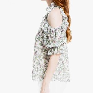 Chic floral blouse with cold shoulder design. Features ruffle sleeves and a delicate pattern. Ideal for stylish outings.