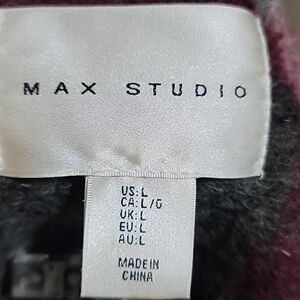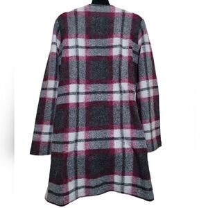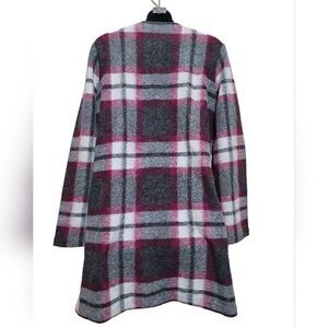 Preowned Max Studio Gray Red White Open Front Plaid Coat Woolblend with Pockets Sz Large. Coat is in excellent condition.