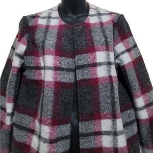 Max Studio Gray Red White Open Front Plaid Coat Woolblend Sz Large